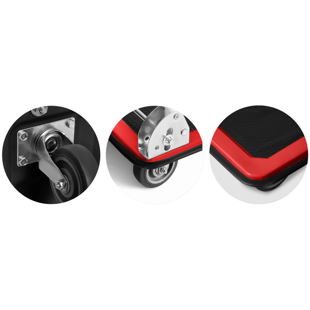 A HM-505 platformos kézikocsi megkönnyíti a nehéz terhek mozgatását. A porfestett acél vázra épülő, csúszásgátló PVC felületű rakfelület akár 150 kg-ot is elbír, így boltban, raktárban vagy költözéskor is megbízható társ. A fekete-piros megjelenés nemcsak mutatós, de a gumírozott ütközőperem védi a falakat és bútorokat a karcolástól. Mindössze 8,2 kg, mégis masszív és tartós megoldás a mindennapi feladatokra.