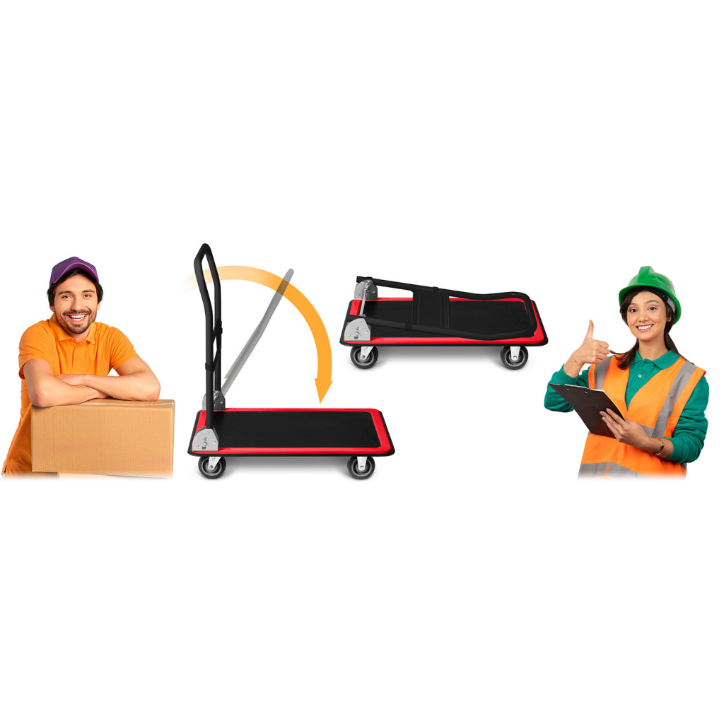 Erős, de könnyű szerkezetének köszönhetően egyetlen mozdulattal gördítheted át a legnehezebb dobozokat is a célállomásra. Az összecsukható, ergonomikusan formált tolókar kis helyen elfér, így a kocsi tárolása és szállítása sem okoz gondot. A teljes körben forgó gumi kerekek precíz kanyarodást tesznek lehetővé, a bordázott felület pedig megakadályozza a rakomány elcsúszását.
