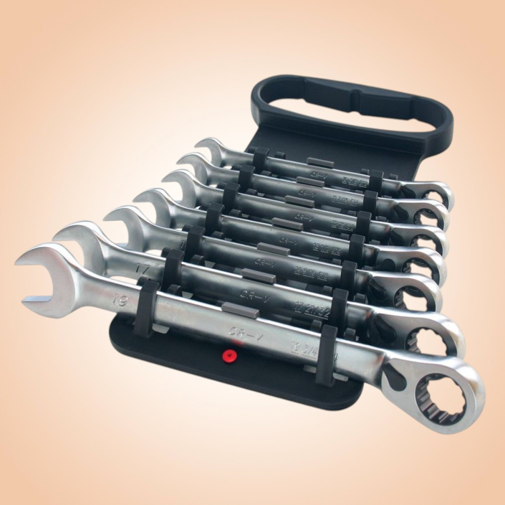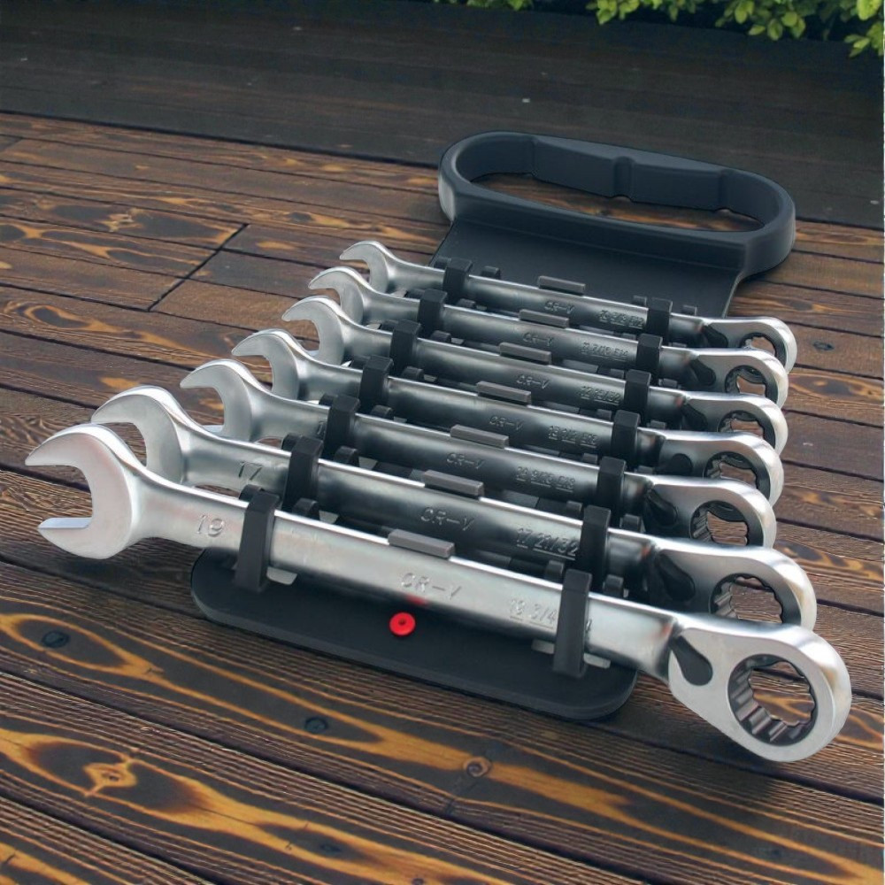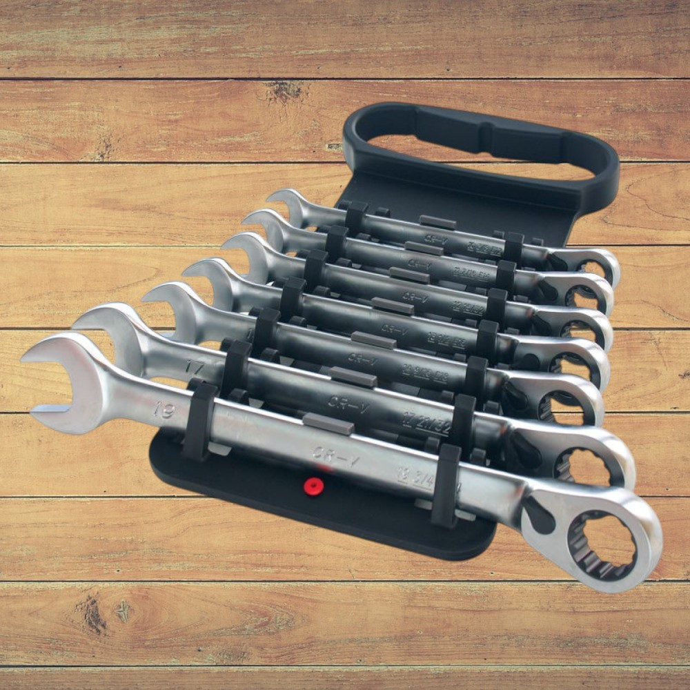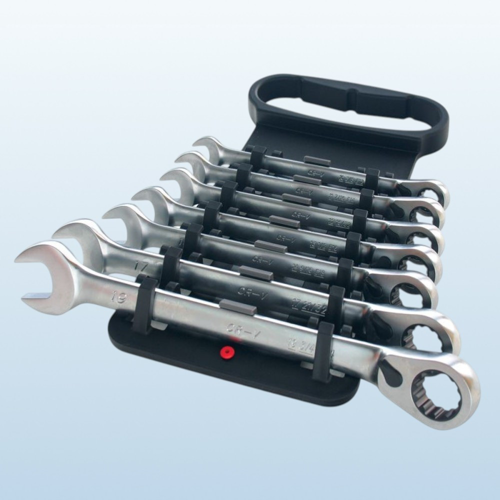 Gyorsabbá és kényelmesebbé teszi a csavarozást: a racsnis mechanika lerövidíti a munkaidőt, a hét kulcs pedig lefedi a legtöbb autó- és gépipari csavarfejet. A pontosan mart gyűrűprofil csökkenti a lekerekedés veszélyét, a króm-vanádium ötvözet pedig óvja a kulcsokat a kopástól. A praktikus tartóban minden méretnek saját helye van, így rendezett, átlátható marad a munkaterület, és mindig azonnal kézre esik a megfelelő kulcs.