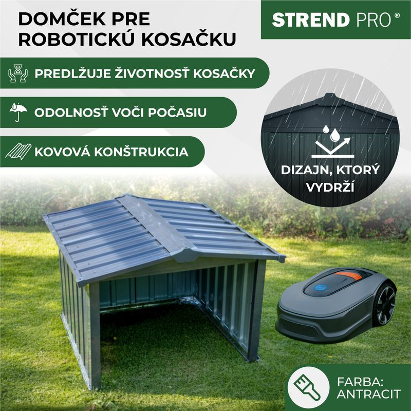 Élvezd a gondtalan pázsitápolást a Strend Pro robotfűnyíró garázzsal! A 86 x 88 x 60 cm-es, antracit árnyalatú fémlemez házikó 0,25 mm vastag, porszórt acélborítással és 0,6 mm-es horganyzott kerettel készül, így megbízhatóan védi robotfűnyíródat eső, hó, jég és UV-sugárzás ellen. Strapabíró szerkezete 20%-kal erősebb a hagyományos kerti tárolóknál, mégis mindössze 10,6 kg, ezért könnyen mozgatható, ám stabilan rögzíthető bármely kertben.