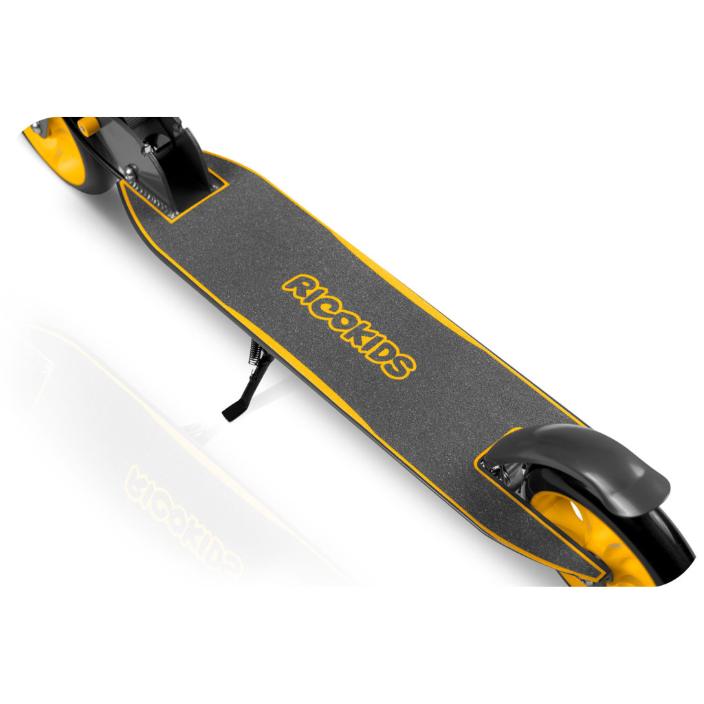 A Ricokids Kodi szürke–narancssárga rollerrel gyereked minden útból kalandot varázsolhat! A mindössze 2,9 kg-os, könnyű vázzal készült járgány egyszerűen összecsukható, így egy mozdulattal befér az autó csomagtartójába vagy a szekrénybe. A 145 mm átmérőjű, PU gumiból készült kerekek és az ABEC-7 csapágyak kisimítják a járda egyenetlenségeit, a széles, csúszásmentes deck pedig magabiztos tartást ad a 3–8 éves kis motorosoknak.