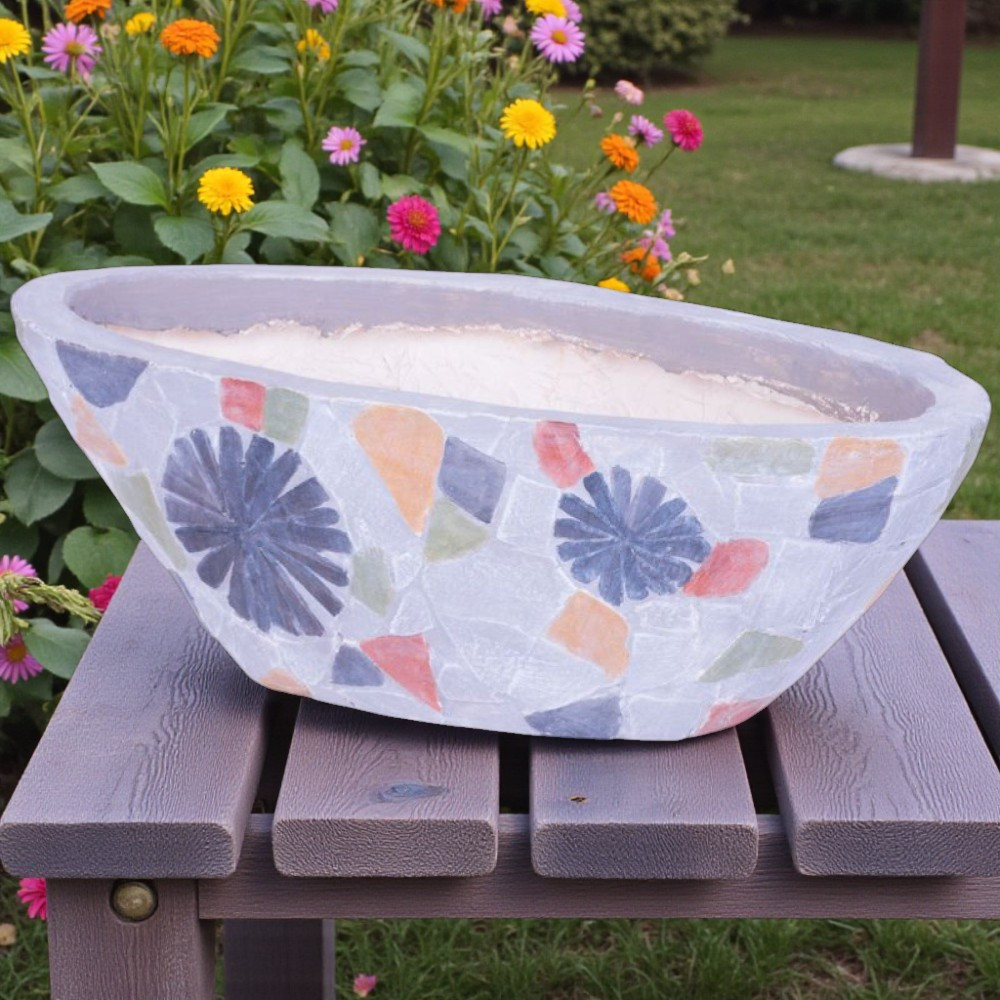 Az egyedi, kézzel kirakott mozaik mintázat minden darabot megismételhetetlen műalkotássá tesz, így garantáltan vonzza a tekintetet. A széles perem egyszerűvé teszi az öntözést, a lapos alj stabil elhelyezést biztosít párkányon, asztalon vagy erkélykorláton. A kerámia természetes légáteresztése csökkenti a pangó víz kialakulását, ami egészségesebb gyökérzetet eredményez. Könnyű súlya ellenére masszív, így feldíszítheted vele kültéri pihenősarkod vagy beltéri ablakpárkányod anélkül, hogy aggódnál a törékenység miatt.