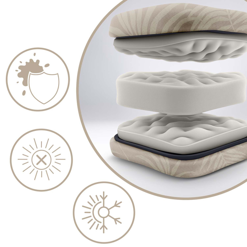 Dupla kényeztetés: egyszerre két fő élvezheti a pihenést, így nem kell várni a sorodra. A levehető, tapintásra puha párna stabilan rögzül, és szellős szövete gyorsan szárad, ha vízparton használod. A karcálló porszórt váz ellenáll az időjárásnak, a csúszásgátló lábak biztosítják a fix tartást a teraszon és a fűben is. Mindössze 13 kg-os össztömege miatt könnyen mozgatható a kert egyik végéből a másikba.