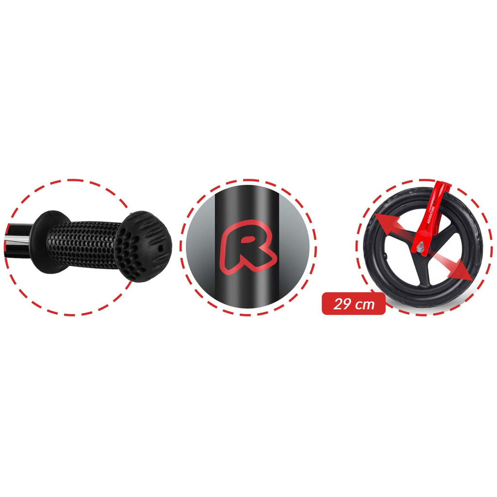 Kétkerekű futóbicikli, Ricokids Fun Adventure, fekete, acél váz, EVA hab kerekek 29 cm, állítható ülésmagasság 32–42 cm, hátsó fék, ultrakönnyű