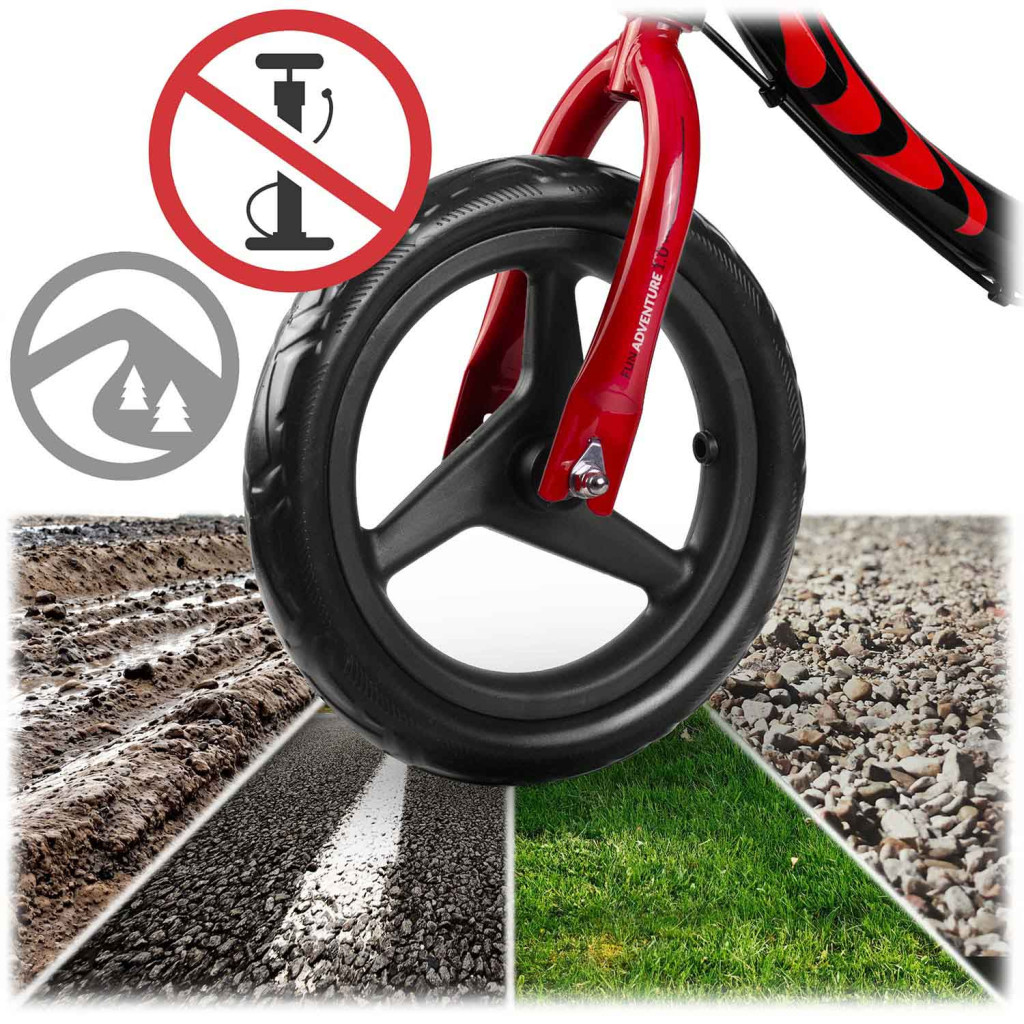 Az ultrakompakt vázat a 360°-ban forgatható első villa egészíti ki, így a kicsik könnyedén kerülik meg a padokat, pocsolyákat és kavicsokat. A habkerekek soha nem laposodnak le, mégis finoman rugóznak, ezért nincs több lefulladt séta. A kerékpár szállítása is gyerekjáték: a pehelysúlynak köszönhetően anya vagy apa egy kézzel felkaphatja, miközben a másikban a bevásárlótáskát tartja. Ideális társ minden évszakban, hiszen az EVA hab ellenáll az UV-sugárzásnak, a víznek és a hidegnek.