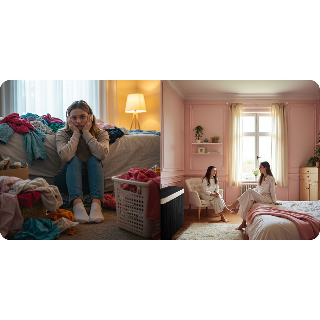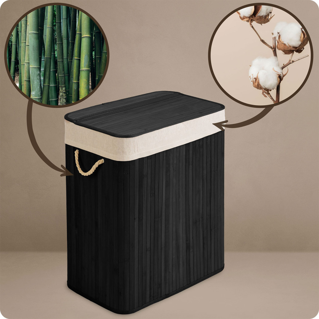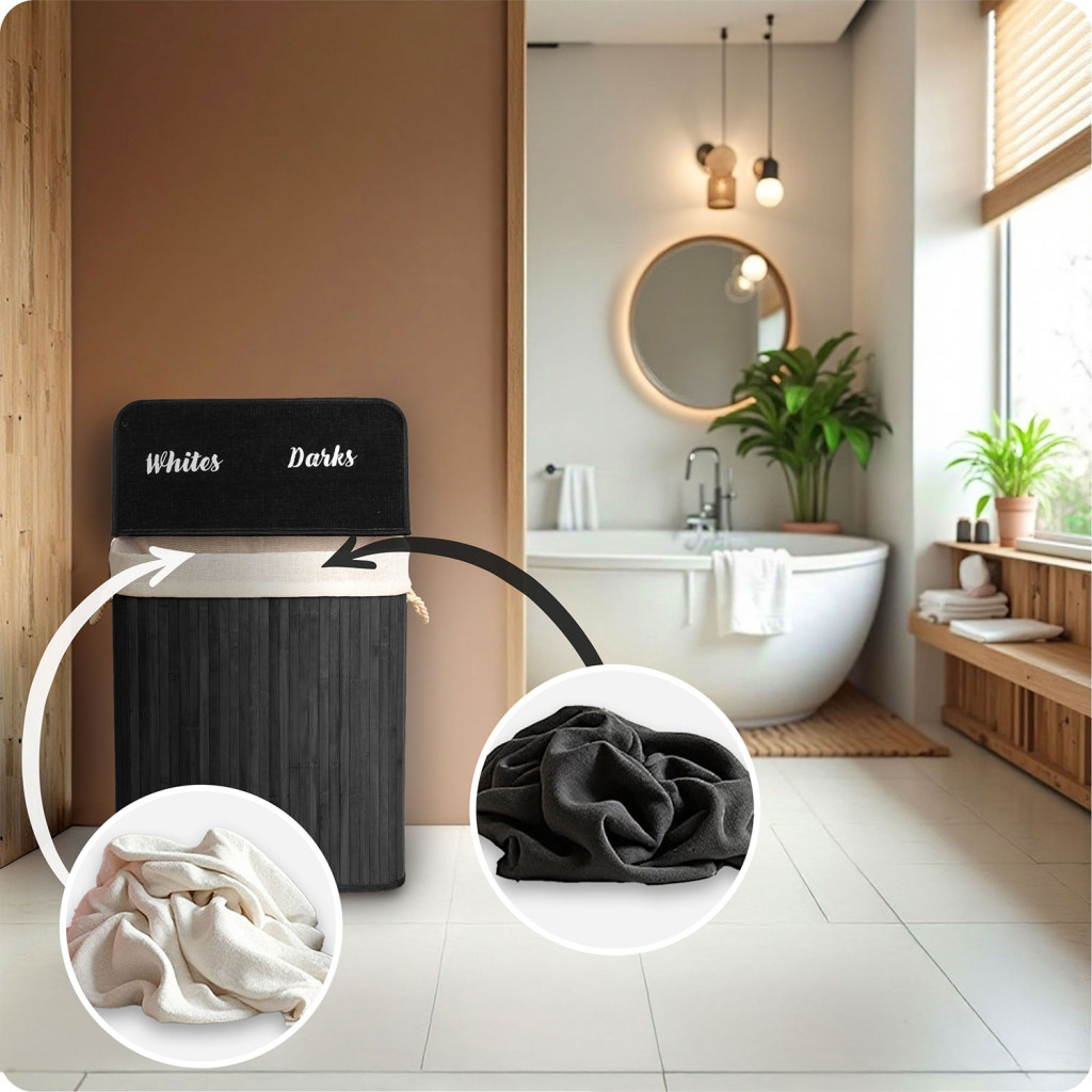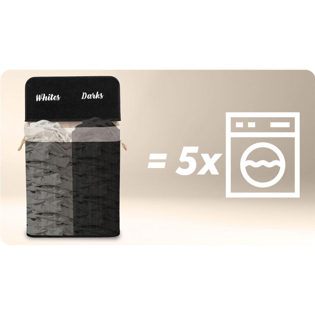 Egyszerre kínál hatalmas, öt mosásnyi kapacitást és átgondolt rendszerezést: a dupla rekesznek hála elfelejtheted a hosszadalmas válogatást mosás előtt. A bambusz természetes antibakteriális tulajdonságai és a légáteresztő pamut betét együtt gondoskodnak arról, hogy a szennyes ne dohosodjon be. Az erős, mégis könnyű szerkezet 2,8 kg-os súlyával bárhová áthelyezhető, így minden fürdő- vagy hálószobában helytáll.