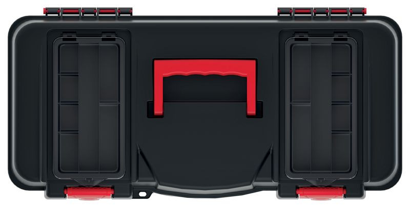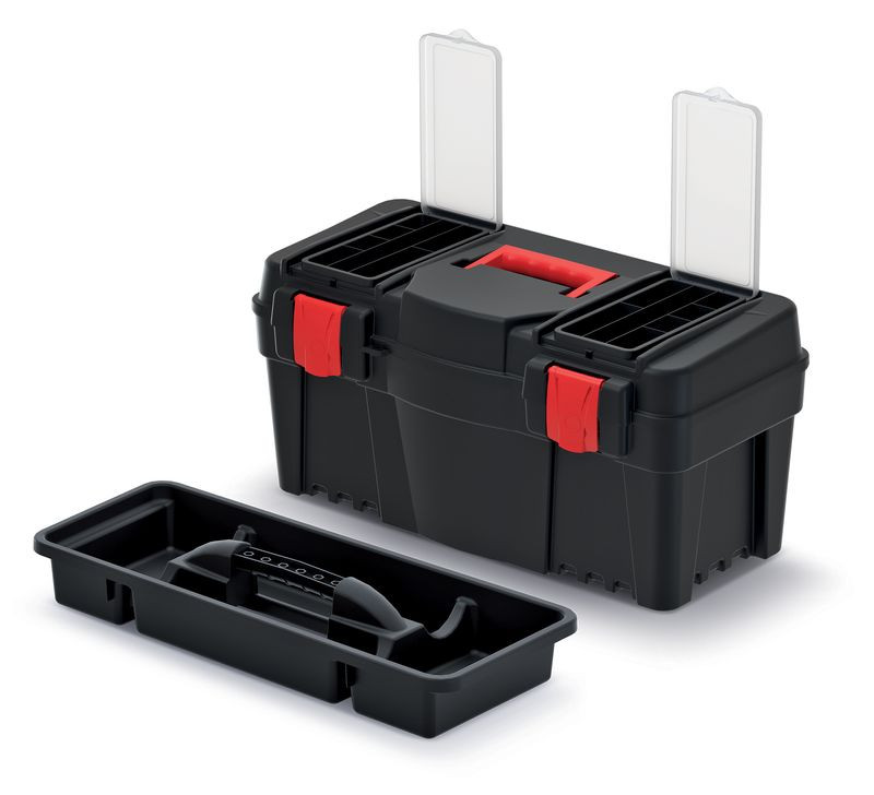 A masszív falvastagság és a bordázott alj stabilitást ad, így a láda nem deformálódik akár nagyobb terhelés mellett sem. A fekete–piros dizájn letisztult, mégis azonnal felismerhető a munkahelyen. A tetején található két átlátszó fedelű rekeszben a kis alkatrészeket rendszerezheted, míg a tágas belső térben a nagyobb szerszámok kapnak helyet. A központi fül kényelmes fogást biztosít, így a ládát egy kézzel is magabiztosan hordhatod.