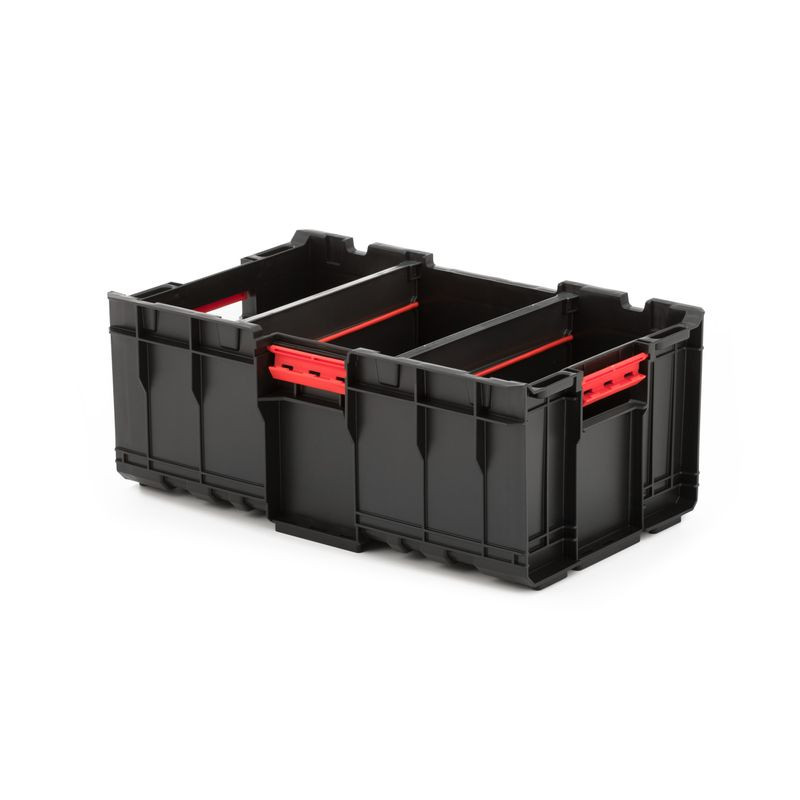 Profik és barkácsolók igazi társa: a moduláris csatlakozórendszerrel stabilan kapcsolódik más Qbrick ládákhoz, így a szállítás és a tárolás egyaránt rendezett marad. A nagyméretű, nyitott belső tér nem szab határt a különleges formájú alkatrészeknek, csöveknek, festékesdobozoknak sem. A piros fogantyúk és vezetősínek segítik a gyors mozdulatokat, míg a merevített peremek óvják a ládát a deformálódástól és a repedésektől.