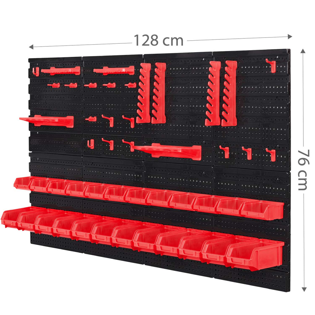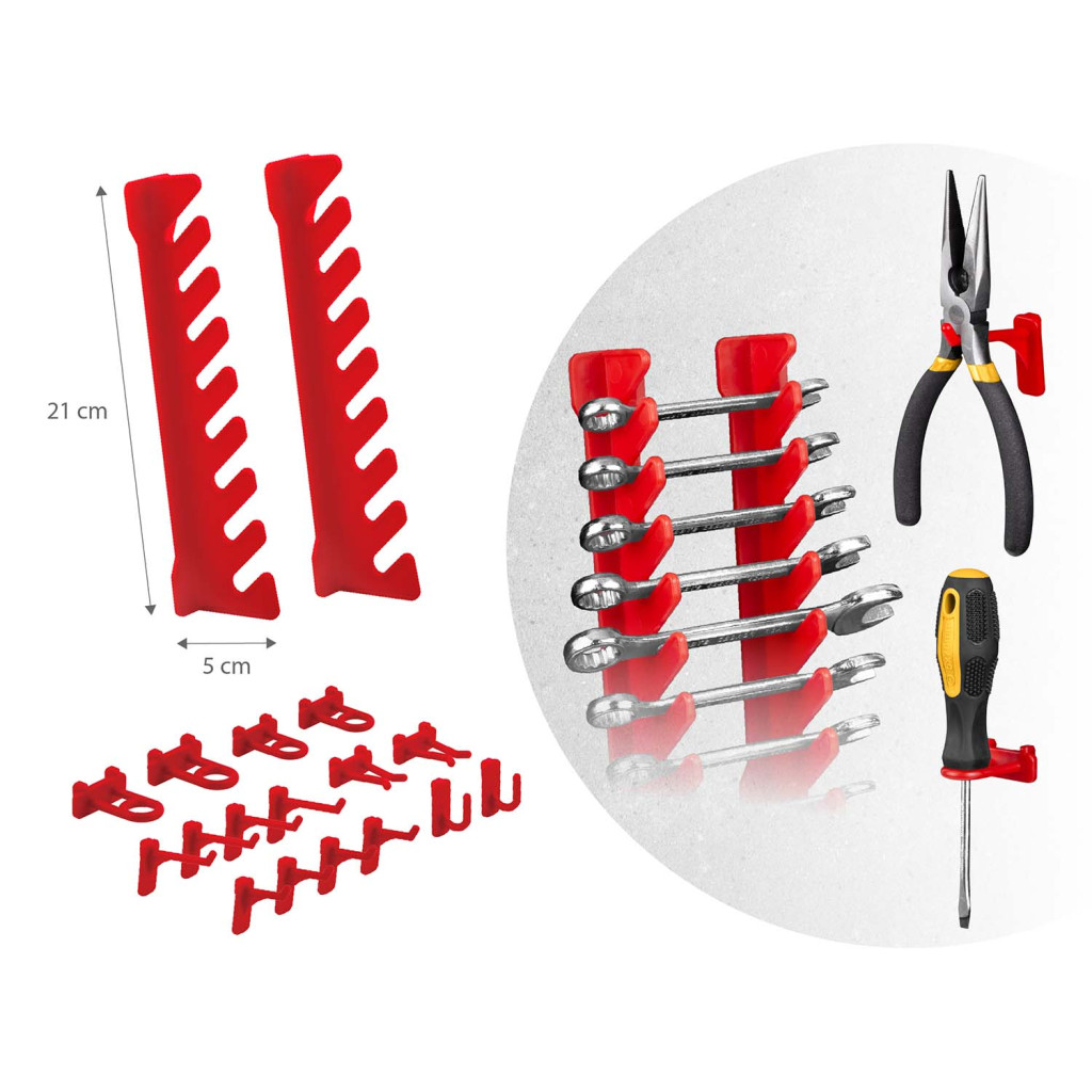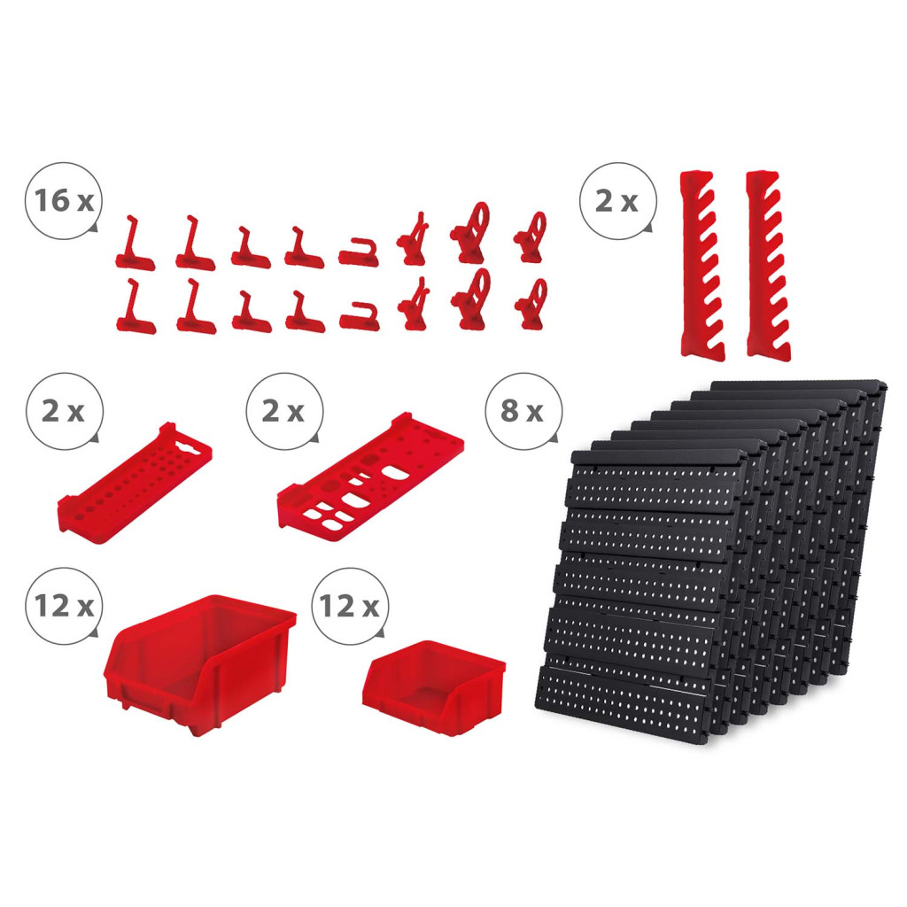 Teremts példás rendet a műhelyedben a Humberg HM-580 fali szerszámtartó panel segítségével! A 128 × 76 cm-es, hat perforált panelből álló fal megerősített műanyagból készül, így ellenáll a mindennapos igénybevételnek. Összesen 54 tartozék – köztük 24 piros tárolórekesz, polcok, kampók és kulcstartók – gondoskodik róla, hogy minden csavar, bit és fogó azonnal kézre essen. A mellékelt tiplikkel gyorsan falra rögzíthető, így értékes munkafelületet szabadít fel.