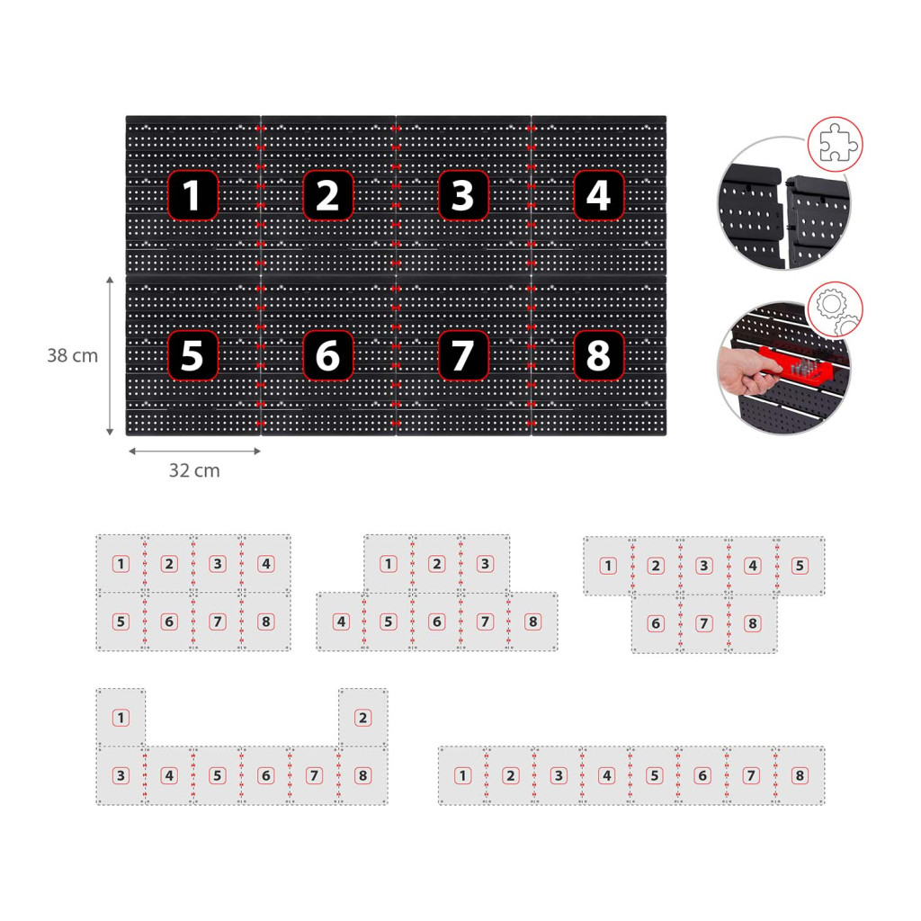 Átláthatóbbá teszi a barkácsolást, mert mindennek kijelöl egy fix helyet, így nem vesztegetsz időt keresgéléssel. A moduláris paneleknek köszönhetően úgy állítod össze, ahogy a munkafolyamatod kívánja: magasra kerülhetnek a kényes mérőszalagok, szemmagasságba a csavarhúzók, alulra pedig a rekeszekbe szortírozhatod a kötőelemeket. A fekete-piros kontraszt segít gyorsan megtalálni a kívánt szerszámot, a strapabíró anyag pedig hosszú éveken át őrzi formáját.