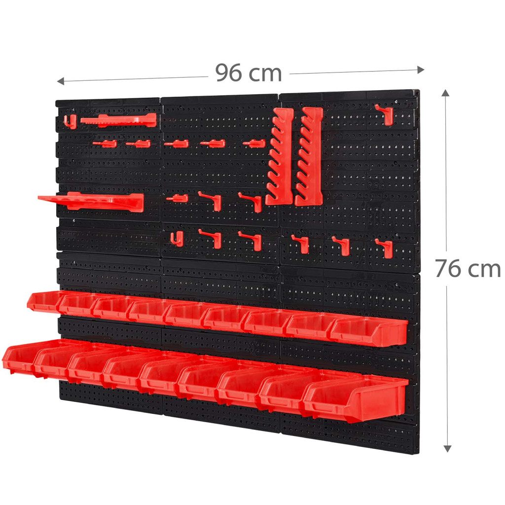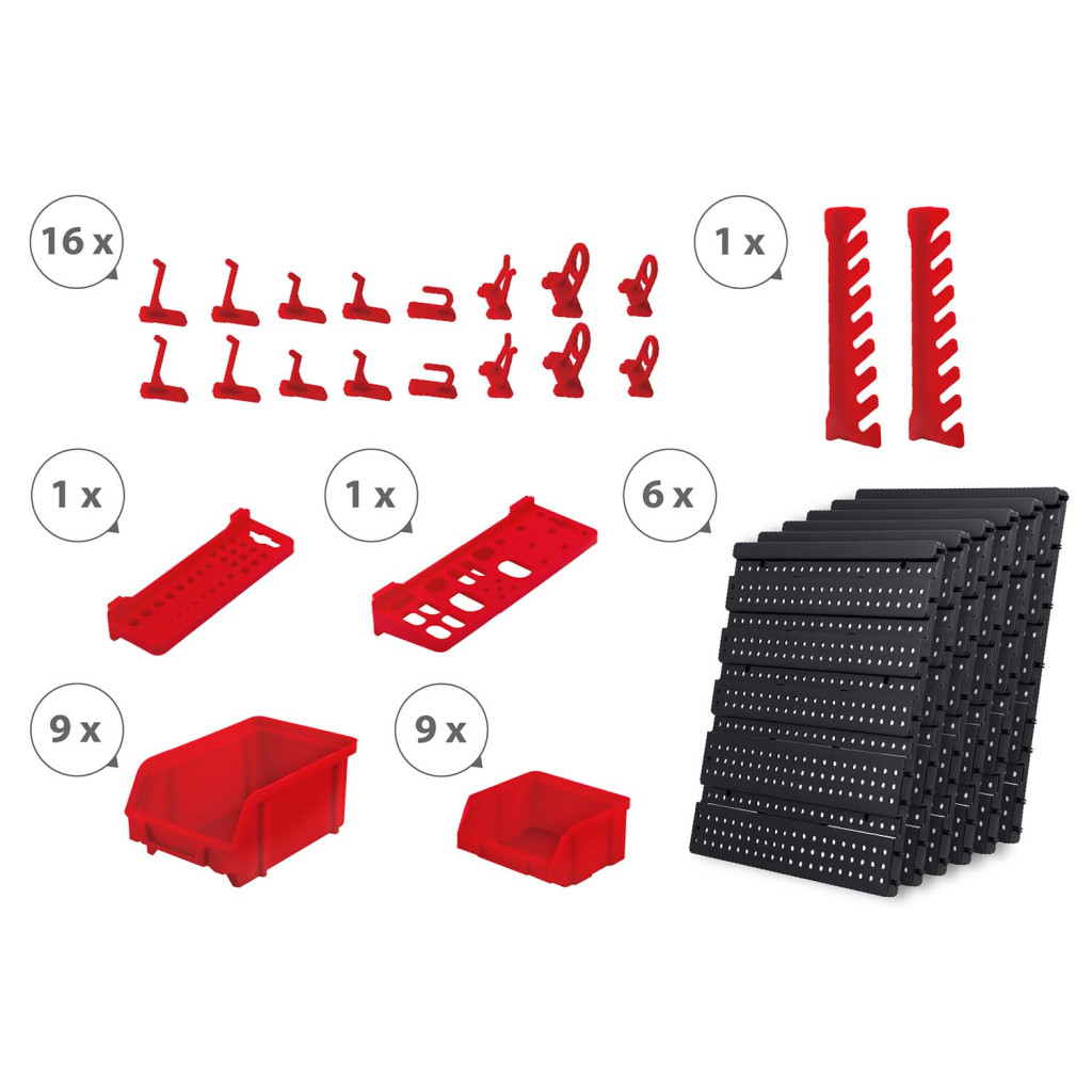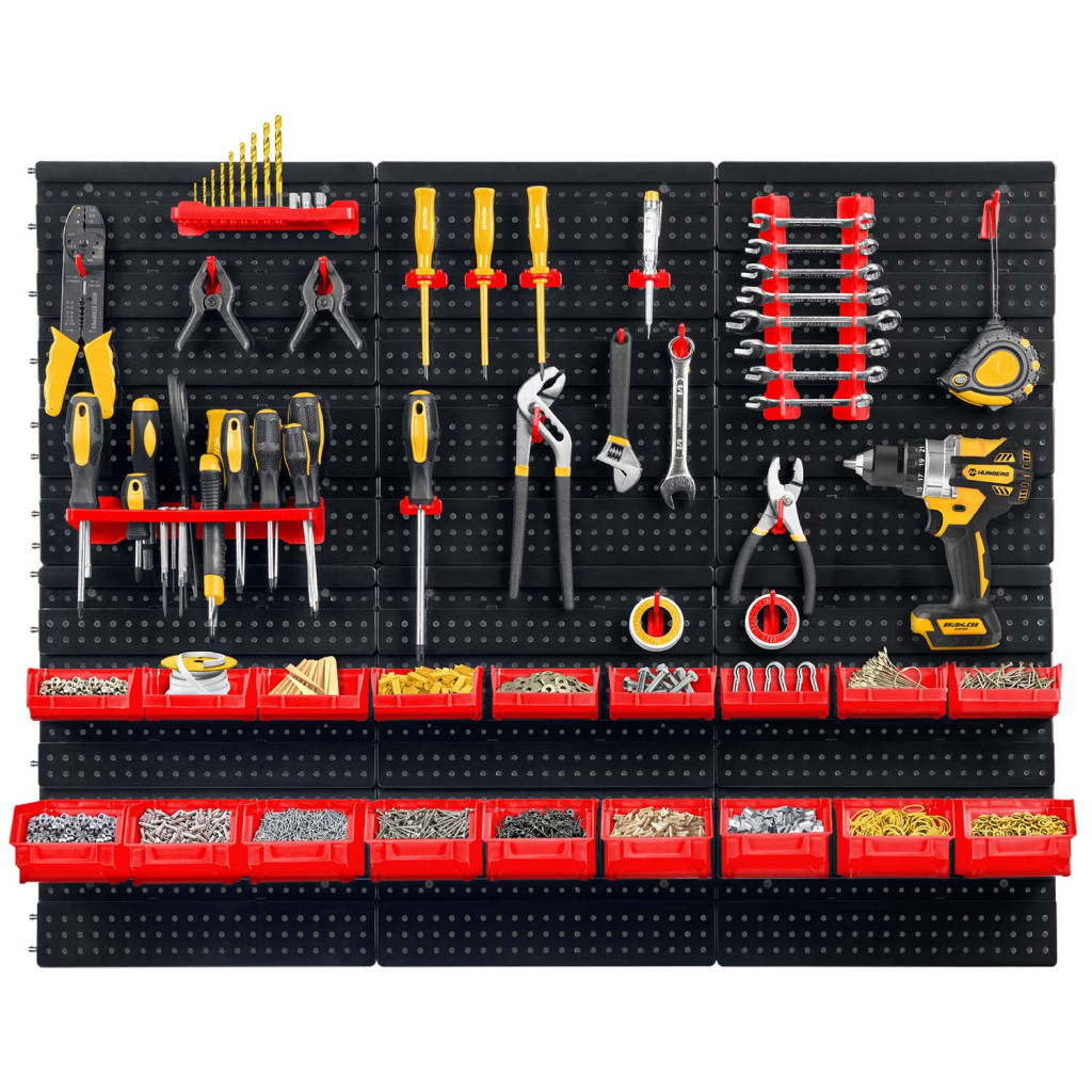 Szabadíts fel értékes helyet, és teremts katonás rendet a műhelyben a Humberg HM-581 fali szerszámtartó panellel! A 96 x 76 cm-es, hat darab perforált panelből álló rendszer megannyi eszköznek biztosít jól áttekinthető otthont. A fekete, erősített műanyag háttér és a rikító piros tárolók nemcsak látványosak, hanem tartósak is, így a kalapácstól a csavarig minden a helyére kerül, ráadásul könnyen elérhető marad.