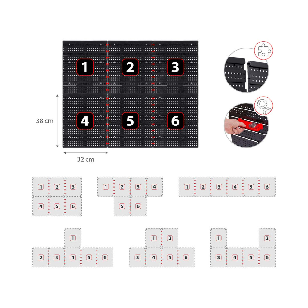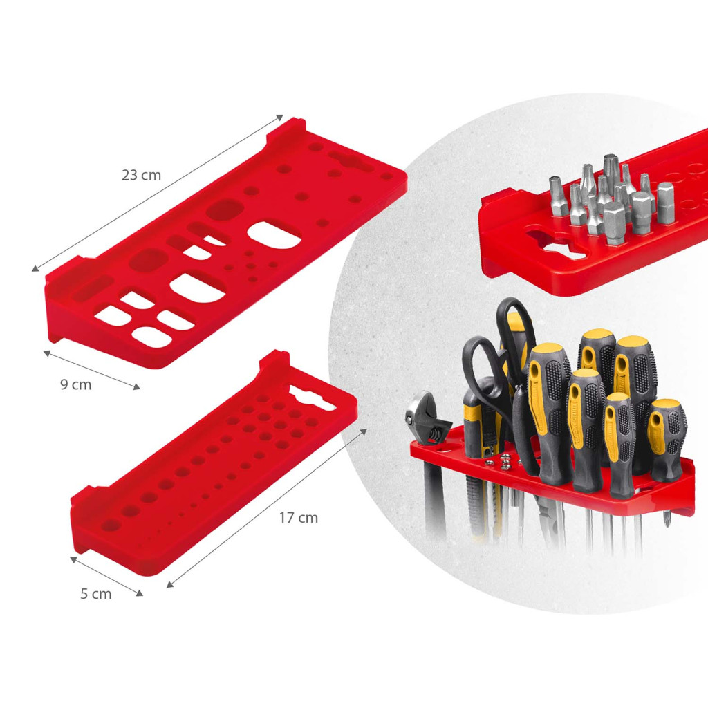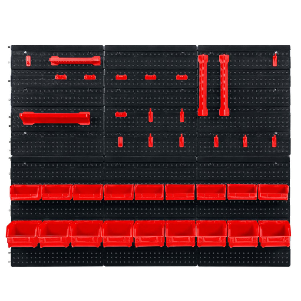 Szabadíts fel értékes helyet, és teremts katonás rendet a műhelyben a Humberg HM-581 fali szerszámtartó panellel! A 96 x 76 cm-es, hat darab perforált panelből álló rendszer megannyi eszköznek biztosít jól áttekinthető otthont. A fekete, erősített műanyag háttér és a rikító piros tárolók nemcsak látványosak, hanem tartósak is, így a kalapácstól a csavarig minden a helyére kerül, ráadásul könnyen elérhető marad.
