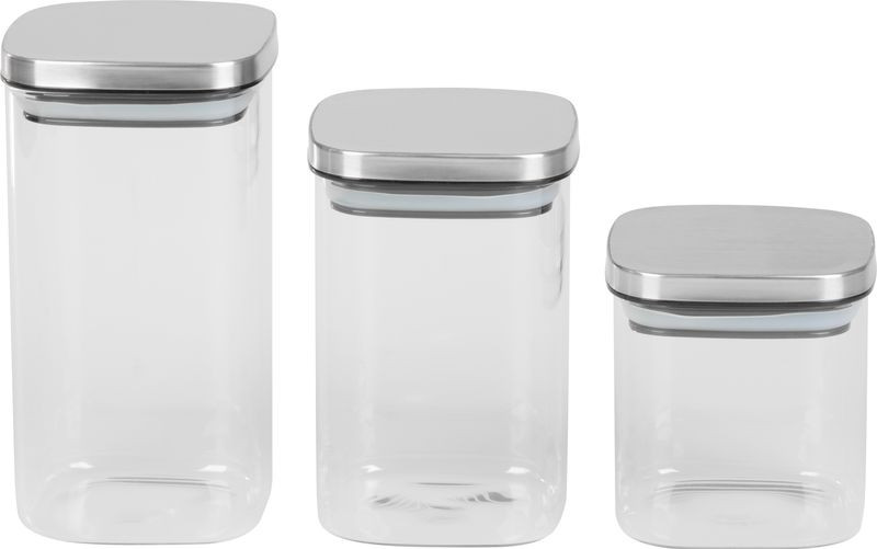 A három különböző űrtartalmú edénnyel minden alapanyagnak jut optimális hely, a gabonától a házi granolán át a kávészemekig. A négyzetes alapforma jobban kitölti a polcot, így több fér a kamrába. Az edzett üveg nem veszi át a szagokat, ellenáll a karcolódásnak, s hűtőben is bátran használható. A fedő elegáns, matt acélfelülete harmonizál a modern konyhai gépekkel, ráadásul a szilikon tömítés cseppmentes védelmet ad.