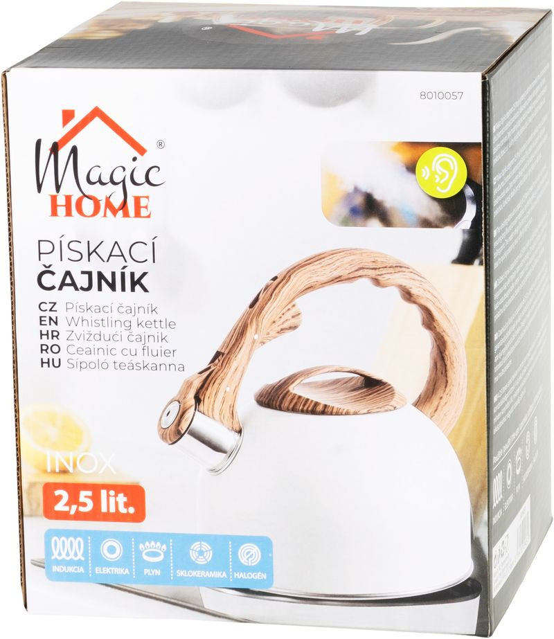 A MagicHome 2,5 literes, sípoló teáskannája fehér bevonattal és faerezetű nyéllel azonnal feldobja a munkapultot. Rozsdamentes acél testének köszönhetően gyorsan felmelegszik, így pillanatok alatt kész a forró víz teához, kávéhoz vagy akár instant leveshez. A 19 cm-es talp stabilan áll bármely főzőlapon, míg a 21,5 cm-es fogantyúmagasság biztonságos, kényelmes kiöntést tesz lehetővé még teljes űrtartalom mellett is.