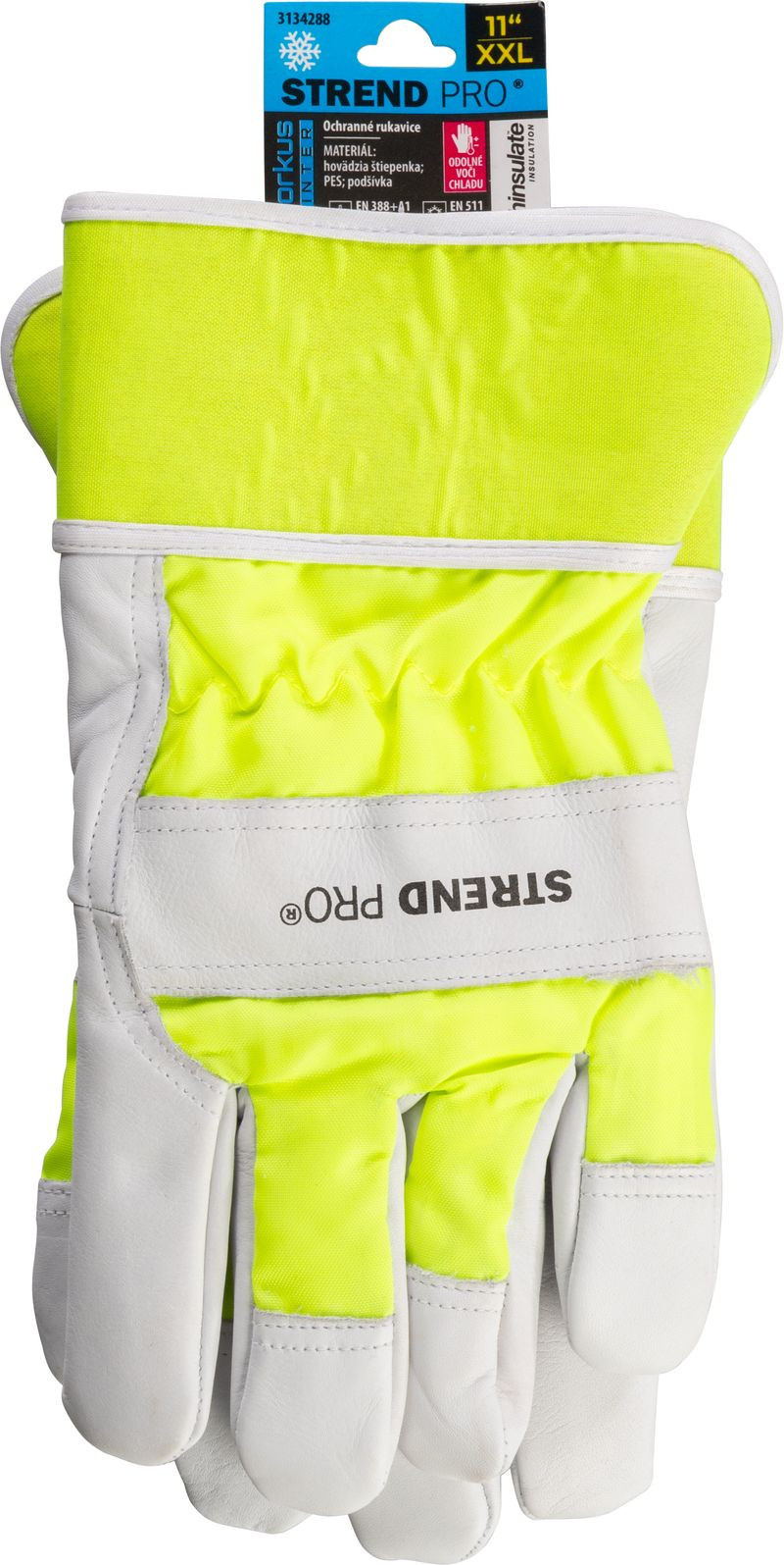 A Strend Pro Workus Winter bélelt, téli védőkesztyű XXL-es méretben biztos fogást és kellemes meleget kínál fagyos környezetben végzett munkához. A hasított marhabőr tenyér nagy kopásállóságot, a poliészter hát rugalmas mozgásszabadságot ad. A 3M Thinsulate bélés hatékonyan zárja bent a testhőt, míg a dupla varratok hosszú élettartamot garantálnak. Fluoreszkáló citromsárga mandzsettája javítja a láthatóságot, így sötétben is biztonságot teremt.