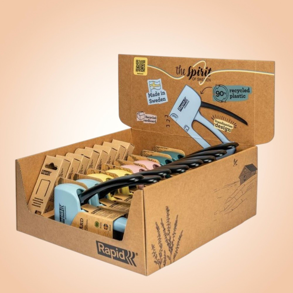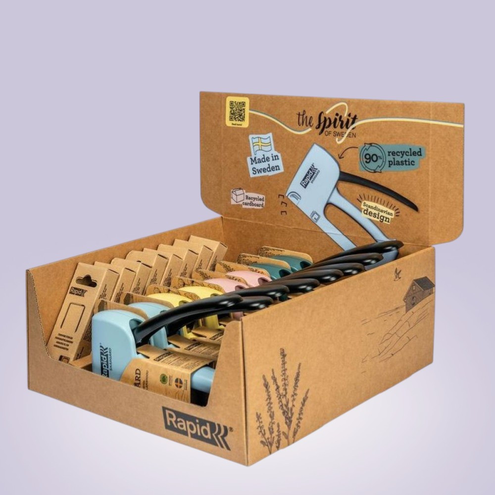 Szabadítsd fel a kreativitásod a RAPID Spirit of Sweden R13 kézi tűzőgépkészlettel! A svédországi Hestrában gyártott eszköz 90 %-ban újrahasznosított műanyagból készült, így a precíz, tartós működés mellett a fenntarthatóságot is szolgálja. A 13 típusú kapcsok 4–10 mm-es hosszban gondoskodnak a biztos rögzítésről, legyen szó kárpitozásról, poszterek rögzítéséről vagy bőr javításáról. A dobozban 8 változatos pasztellszínű tűzőgépet és 8 csomag kapcsot találsz, így rögtön indulhat a munka.