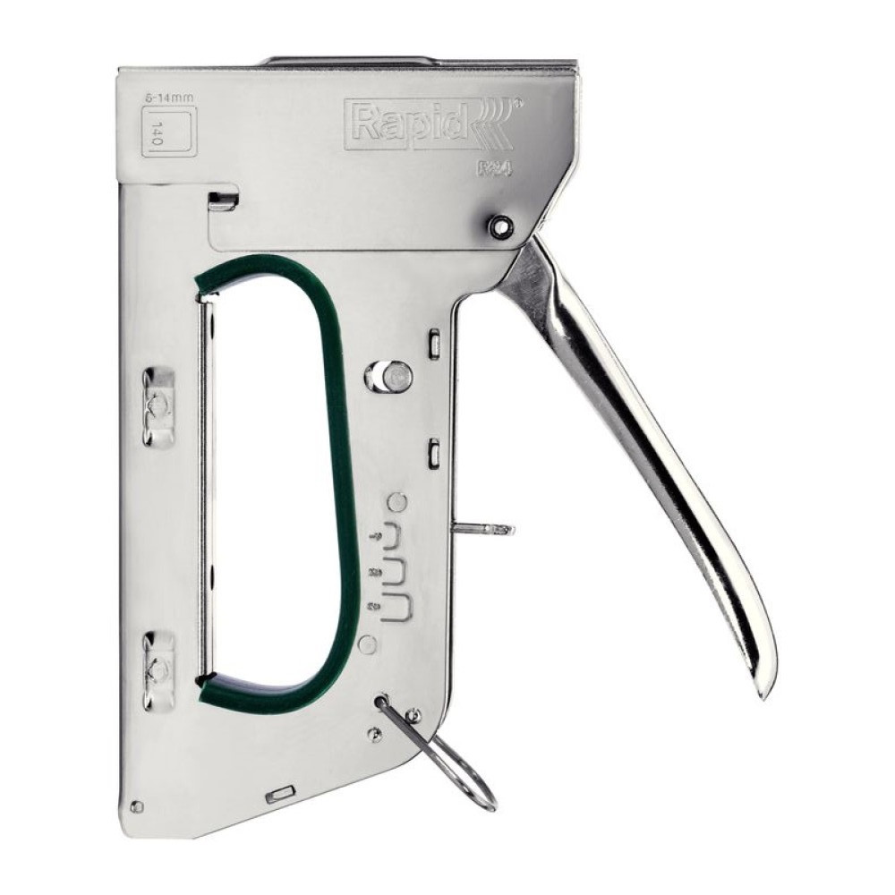 Masszív, teljesen fémből készült Rapid R34 kézi tűzőgép, amely professzionális kárpitos és építőipari feladatokhoz egyaránt megbízható társ. A 140-es típusú kapcsokat 6–14 mm hosszban fogadja, így textilt, fóliát, szigetelőanyagot vagy vékony faelemeket is stabilan rögzít. Szabadalmaztatott kioldószerkezete akár 40 %-kal csökkenti a kar lenyomásához szükséges erőt, a háromfokozatú erőszabályzó pedig biztosítja, hogy puha és kemény felületen is pontosan, kifeszítés nélkül dolgozhass. Mindössze 0,9 kg-os súlyával kényelmesen kézben tartható, mégis rendkívül tartós.
