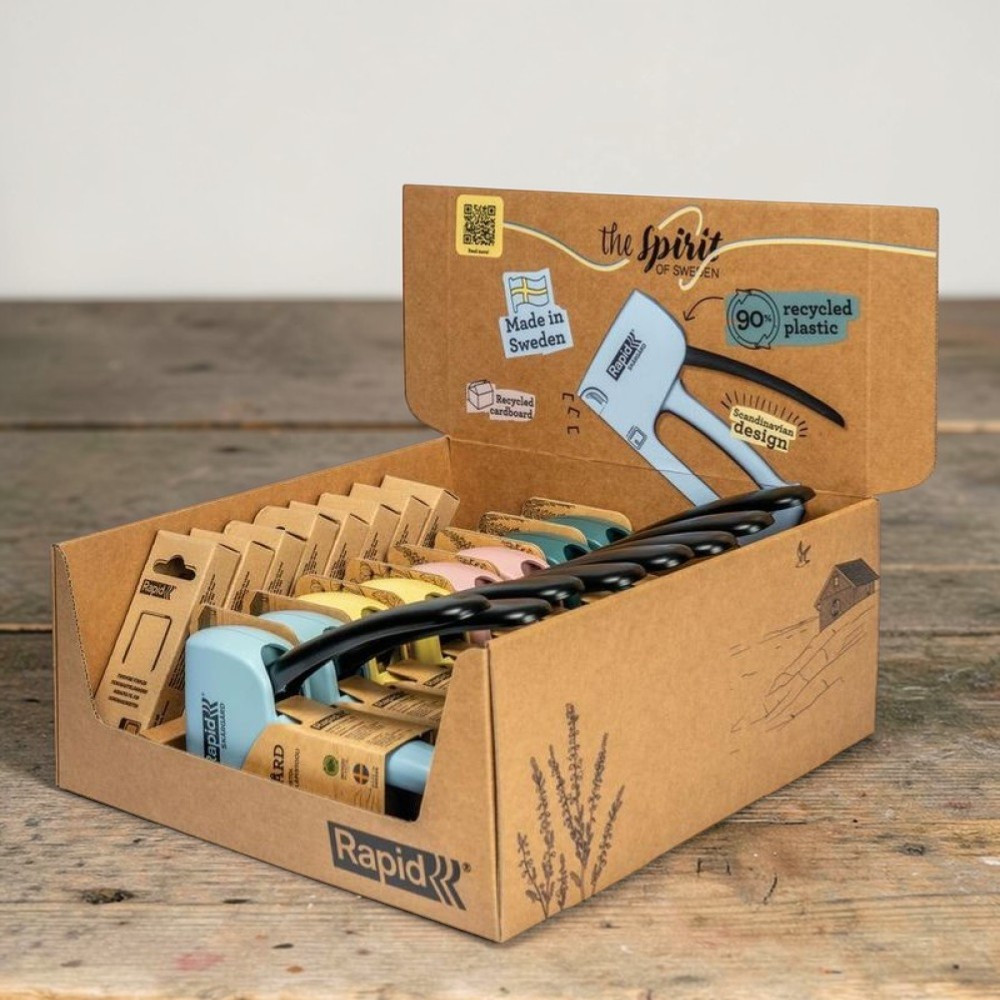 Emeld új szintre a barkácsolást és dekorálást a RAPID Spirit of Sweden R53 kézi tűzőgép-szettel! A skandináv formavilágú eszköz 90%-ban régi hűtőszekrényekből származó újrahasznosított műanyagból készül, mégis masszív acél belsővel dolgozik. 53 típusú kapcsokat fogad 4–10 mm hosszban, ezért egyaránt alkalmas bútorok kárpitozására, poszterek, textilek, bőr vagy vékony faelemek rögzítésére. A dobozban nyolc pasztellszínű tűzőgépet és ugyanennyi kapocssínt találsz, így az egész műhely azonnal munkára kész.
