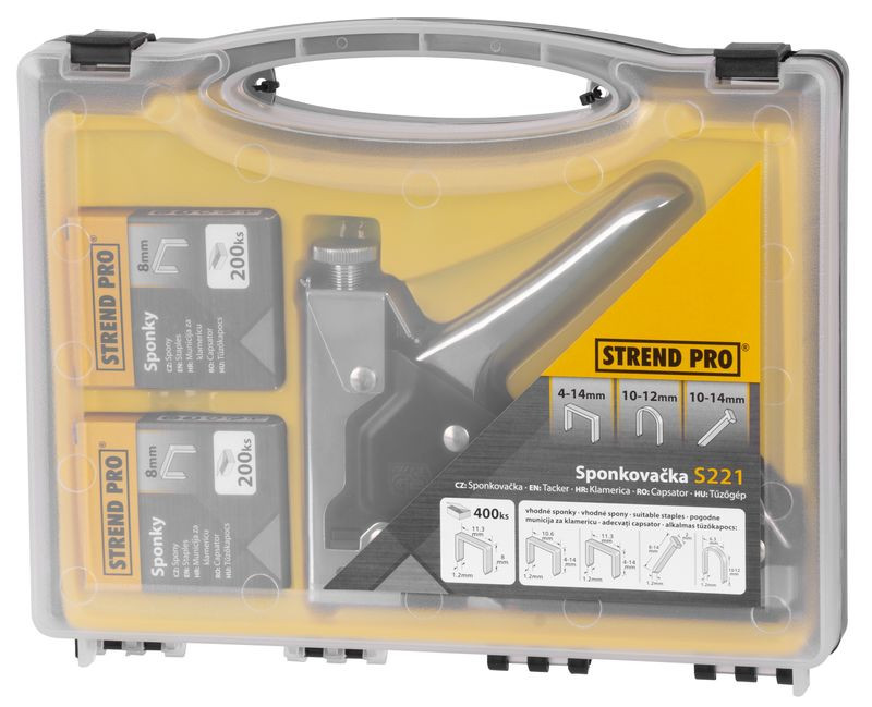 A Strend Pro S221 kézi tűzőgép masszív fémszerkezete és ergonomikus, piros betétes markolata révén megbízható társ minden rögzítési feladatnál. A 4–14 mm hosszúságú C típusú kapcsokkal, 10–12 mm-es D kapcsokkal és 10–14 mm-es B szögekkel dolgozik, így könnyedén összeillesztheted a szövetet, kárpitot, fóliát, kartont vagy fa léceket. A felső feszítőcsavar segítségével testre szabhatod az ütés erejét, a gyors kazettás kapocsbetöltés pedig felgyorsítja a munkát. A fekete-ezüst házat a 0,97 kg-os tömeg stabilan a munkadarabon tartja, így a hosszabb projektek sem fárasztóak.