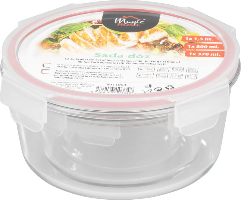 Varázsold rendszerezetté a hűtőt, a fagyasztót és a kamrát a MagicHome kerek, fedeles üvegdoboz-készlettel! A 370, 800 és 1500 ml-es tárolók tartós boroszilikát üvegből készültek, amely kibírja a ‑40 °C-os fagyasztót és a 400 °C-os sütőt is. A négy ponton záródó, szilikon tömítésű PP fedelek szivárgásmentes védelmet adnak, így bátran vihetsz benne levest, szószt vagy salátát útközben. Egyetlen szett, ami lefedi a mindennapi tárolási igényeket.