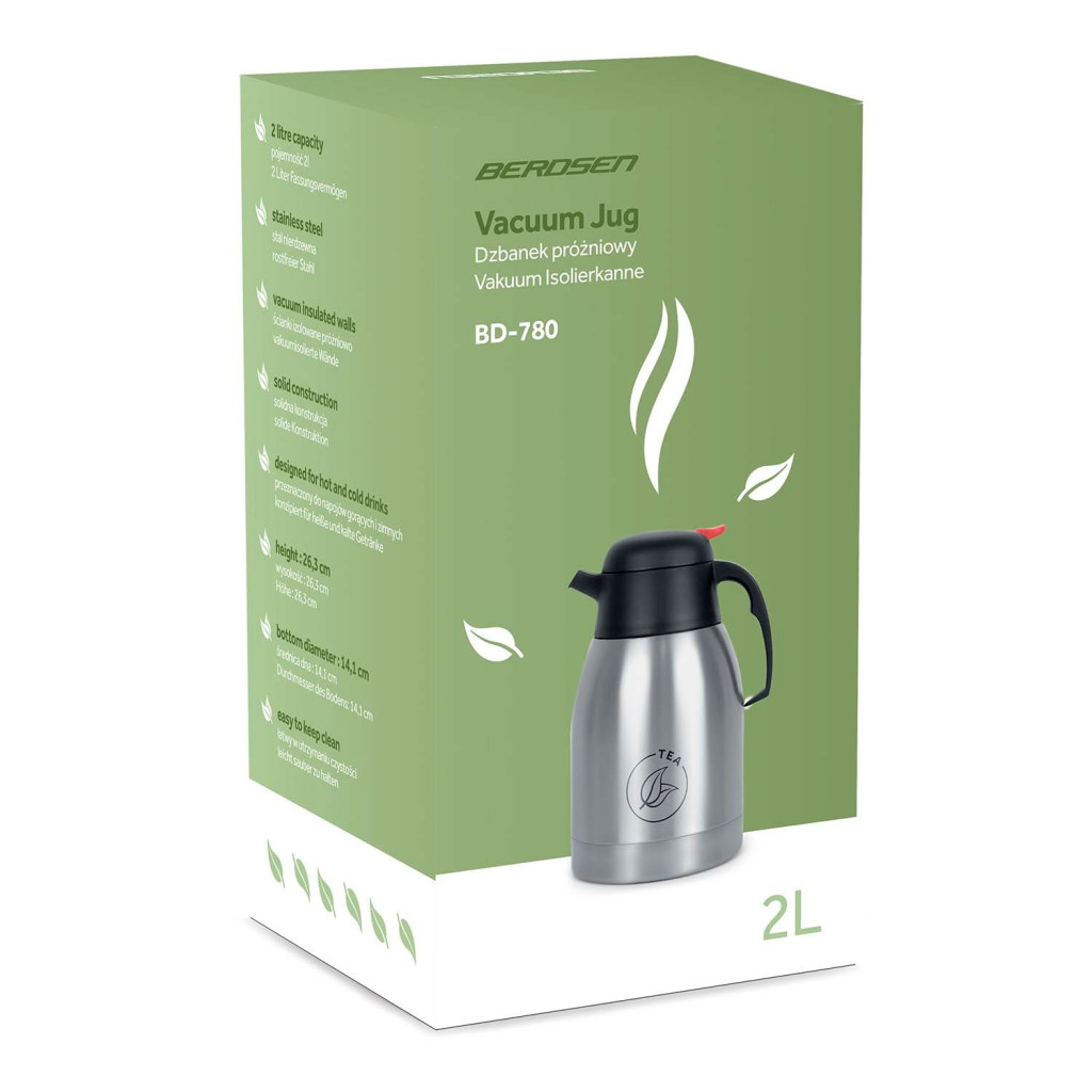 Élvezd a kedvenc teád hőfokát órákon át a Berdsen BD-780 vákuumos termosz kancsóval! A 2 literes, duplafalú rozsdamentes acél test légmentes rétege megbízhatóan bent tartja a meleget vagy a hideget. Ergonomikus markolata stabil fogást ad, a cseppmentes kifolyó és a piros nyomógombos tető pedig gyors, egykezes töltést tesz lehetővé. Otthon, irodában és kiránduláson is praktikus segítőtárs.