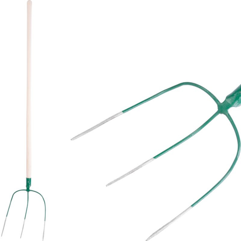 Erős, mégis könnyen kezelhető eszköz, amely megkönnyíti a mindennapi istállói és kerti feladatokat. Háromágú kialakítása ideális a széna levegőztetéséhez, a trágyahalom fellazításához vagy a levágott gallyak összegyűjtéséhez. A kiegyensúlyozott súlyelosztás pontos irányítást tesz lehetővé, a simára csiszolt fa nyél természetes érzetet ad a tenyérnek. A porfestett zöld fej nemcsak mutatós, hanem fokozottan korrózióálló is, így hosszú távon megbízható társad lesz.