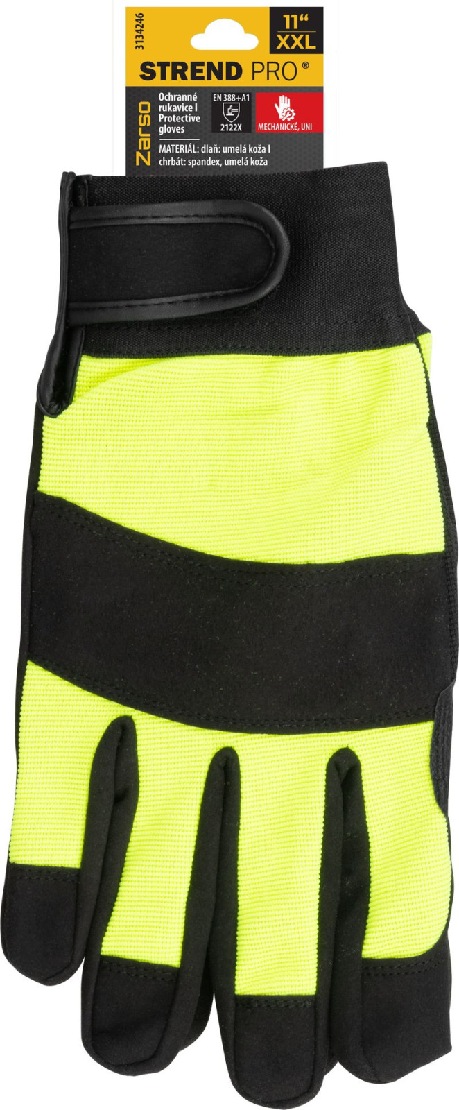 A Strend Pro Zarso védőkesztyű a biztonság és a kényelem találkozása: szintetikus bőrrel borított tenyérrészét erősített varrások teszik strapabíróvá, míg a kézfejen rugalmas spandex követi a mozdulatokat. A fekete-neon sárga dizájn azonnal láthatóvá tesz munka közben, a tépőzáras mandzsetta pedig gyors illesztést kínál. Az EN 388+A1 szabvány szerinti 2122X szint bizonyítja, hogy a kesztyű megbízhatóan véd a mechanikai behatásoktól. Méret: 11/XXL, súly: mindössze 0,14 kg.