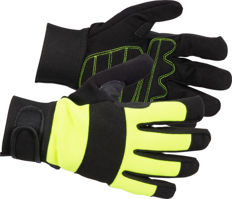 Rugalmas spandex hátrésszel biztosítja a kényelmes mozgást, miközben a szintetikus bőr tenyér erős fogást nyújt. A párnázott réteg mérsékli a rezgést és a súrlódást, ezért finom szerelési feladatoknál és nehezebb barkács munkáknál is megbízható. A könnyen állítható tépőzár egyetlen mozdulattal feszesre húzható, vagy gyorsan oldható. A feltűnő fluoreszkáló sárga betétek gyenge fényviszonyok között is javítják a láthatóságot.