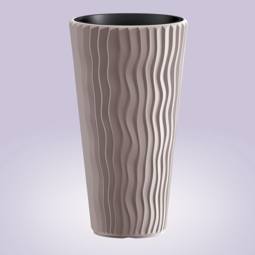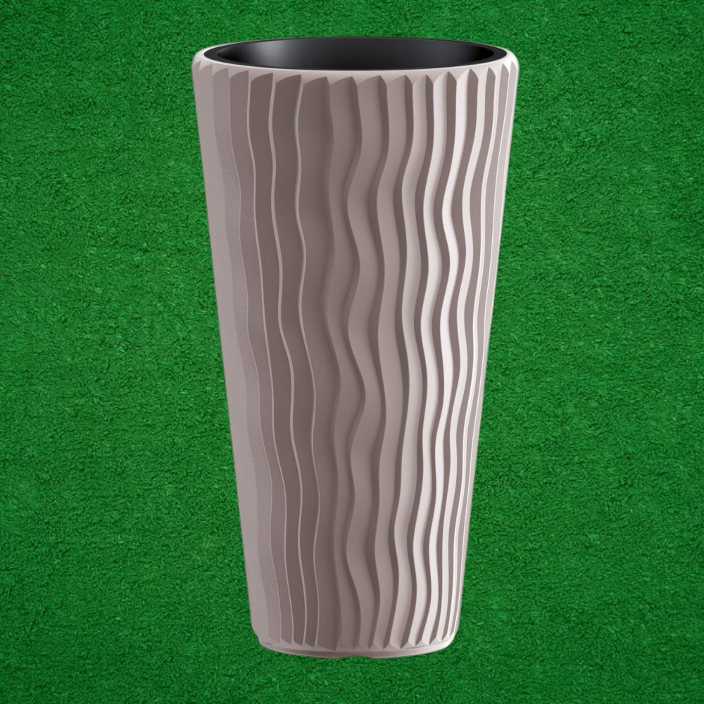 Élénk mokka árnyalatával és markáns, függőleges hullámrajzolatával a Prosperplast SANDY Slim 400 virágcserép azonnal eleganciát csempész otthonodba vagy teraszodra. Magas, karcsú testének köszönhetően látványos fókuszpontot hoz létre, miközben minimális helyet foglal. A kivehető belső betét megkönnyíti az ültetést, csökkenti a virágföld mennyiségét, és biztosítja a gyökerek egészséges levegőzését, a 1,91 kg-os tömeg pedig stabilitást ad szeles időben is.