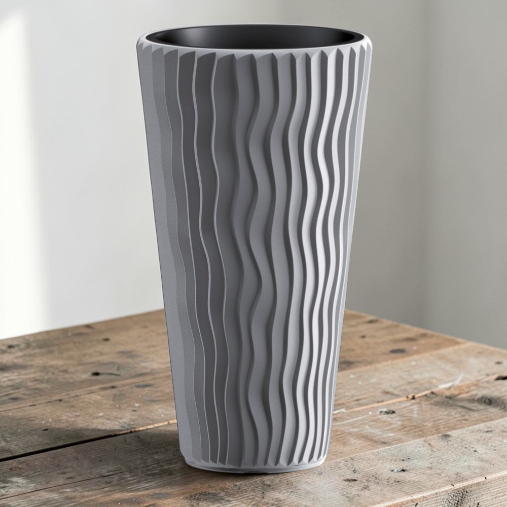 Frissítsd fel otthonod vagy teraszod megjelenését a Prosperplast SANDY Slim 400 virágcseréppel! Magas, karcsú teste alig foglal helyet, mégis látványosan kiemeli kedvenc növényedet. A semleges szürke árnyalat elegánsan keretezi a lombot, az érdes, függőleges hullámminta pedig napfényben dinamikus árnyékjátékot vet a felületre. A mellékelt beültető betét egyszerűvé teszi az ültetést, csökkenti a talajigényt, és stabil, jól szellőző gyökérzónát biztosít. 1,91 kg-os tömege szeles időben is megbízható stabilitást nyújt.