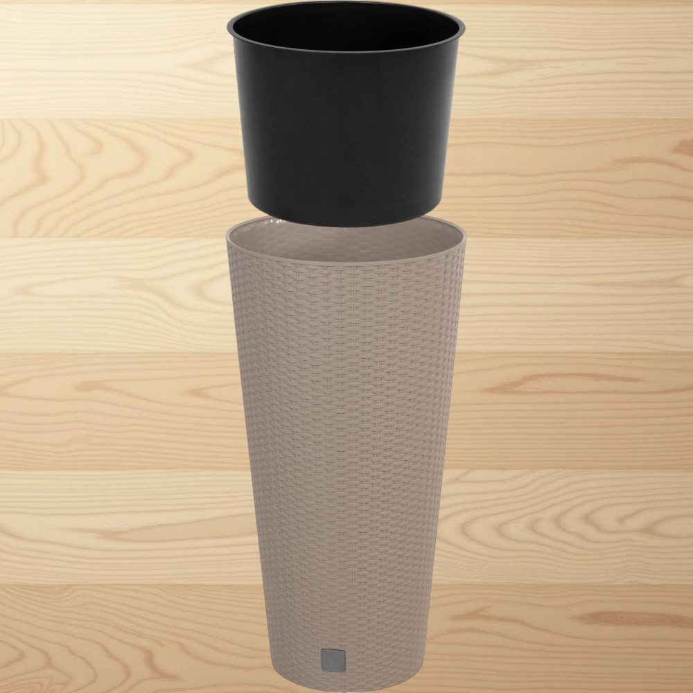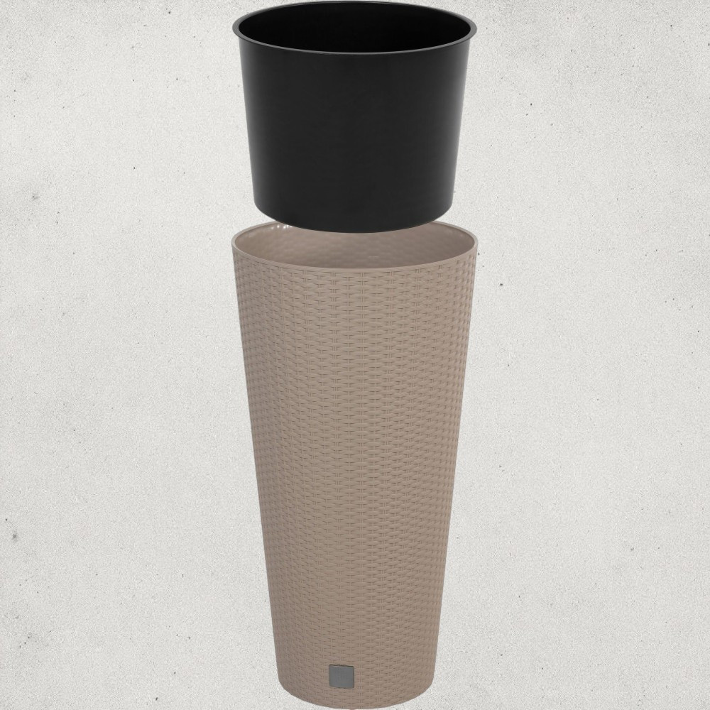 Emeld magasabb szintre nappalid vagy teraszod zöld varázsát a Prosperplast RATO Tubus 400 mokka virágcseréppel! A 40 cm átmérőjű, 76,3 cm magas karcsú henger elegáns keretet ad a pálmáknak, fikuszoknak vagy díszfüveknek. Rattan hatású textúrája a természetes fonott kosarak melegségét idézi, miközben a strapabíró, UV- és fagyálló polipropilén gondoskodik arról, hogy a cserép egész évben ellenálljon az időjárásnak. A 64 literes kapacitás bőséges helyet kínál a gyökereknek, a kivehető 35 literes betét pedig leegyszerűsíti az ültetést.