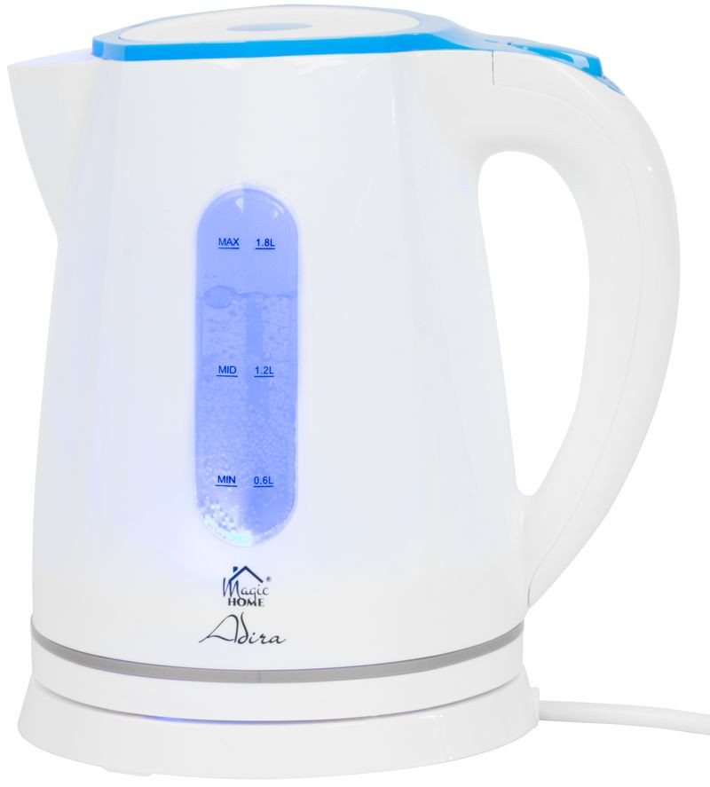 Indítsd a napot egy gőzölgő teával vagy instant kávéval a MagicHome Adira gyorsforralóval! Az 1850–2200 wattos motor pillanatok alatt felforral akár 1,8 l vizet, így a család minden tagja egyszerre jut forró italhoz. A fehér-kék külső stílusosan illik bármely konyhába, míg a rejtett fűtőszál megakadályozza a vízkő lerakódását és megkönnyíti a tisztítást. A 360°-ban elforgatható talp, a fedélnyitó gomb és a könnyen leolvasható vízszint-skála gördülékeny, egykezes használatot kínál.