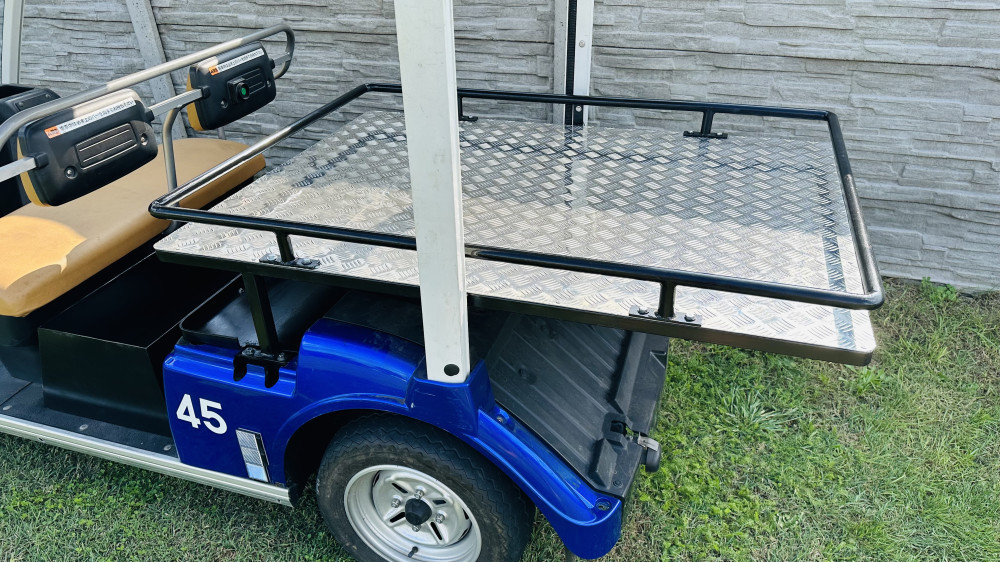 Plexi ablak, 20-30km hatótáv (terep függő), töltőkábel, nagy plató alumíniumból 100x140cm, nagy szerszámos láda 100x40x40, pohártartó, 16A-es 220 V-os töltőcsatlakozó. Plató teherbírása 300kg. Oldalsó áru leesésgátló és kötöző peremmel van felszerelve.